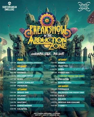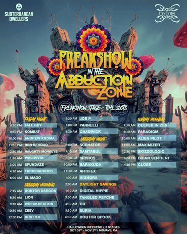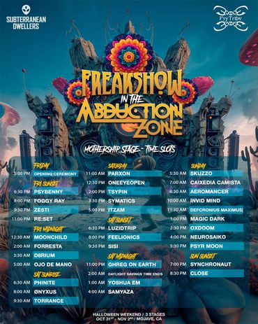 Legends speak of a rift opening once each cycle when sound becomes light, and the desert transforms into a portal. From October 31st - November 2nd, the skies above Southern California will split once again. A convergence of tribes, rhythms, and frequencies drawn together beneath the alien sun and infinite stars.